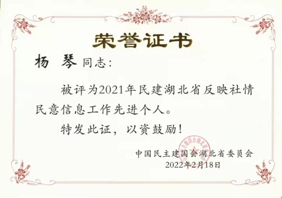 (通訊員 鄒豔 李昌隆)2月18日,我校醫學院副院長、恩施州衛校副校長、民建優秀會員楊琴被民建湖北省委表彰為2021年度民建湖北省反映社情民意信息工作先進個人。2021年度,楊琴先後向省政協、民建湖北省委提交社情民意近10項目,其中《加強電子煙管理淨化青少年成長環境的建議》被評為2021年民建湖北省優秀社情民意信息。