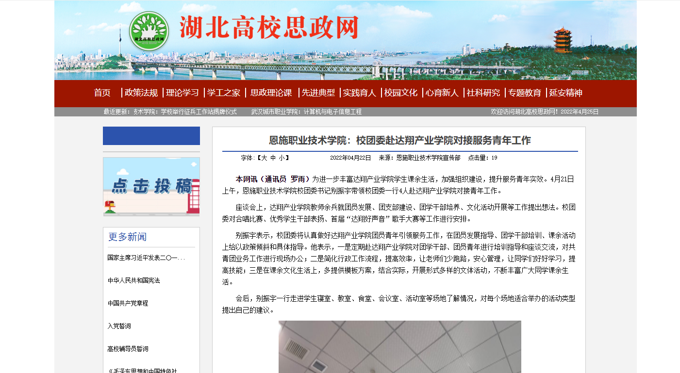 本網訊(通訊員 羅雨)為進一步豐富達翔産業學院學生課餘生活,加強組織建設,提升服務青年實效。4月21日上午,金年会校團委書記别振宇帶領校團委一行4人赴達翔産業學院對接青年工作。