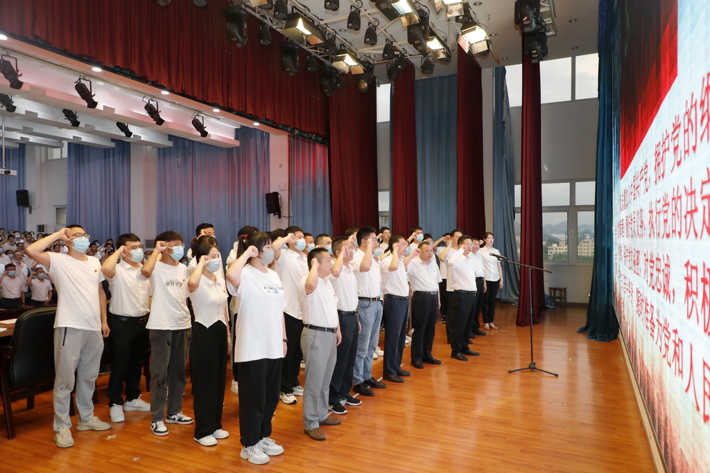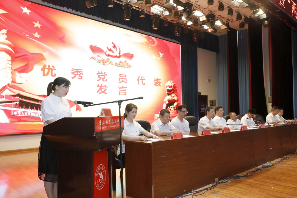 大會在嘹亮的國歌聲中正式拉開帷幕。學校黨委委員、黨委副書記董奎同志宣讀《中共恩施職院黨委關于表揚十佳“優秀共産黨員”的決定》,學校黨委委員、紀委書記陳平财同志宣讀《關于表揚先進基層黨組織、優秀黨務工作者、優秀共産黨員的決定》,學校黨委委員、副校長張如學同志宣讀《關于批準張紅路等48名中共預備黨員轉正和批準胡夢煜等37名同志為中共預備黨員的決定》。随後,在嚴斌書記的領誓下,37名預備黨員面對黨旗莊嚴宣誓。學校黨委班子對表揚的先進集體和先進個人代表進行了頒獎。預備黨員代表張滿,優秀黨員代表畢露上台發言。